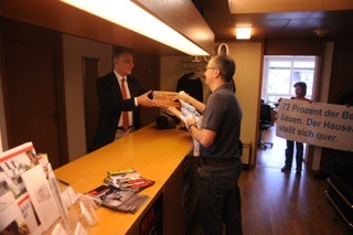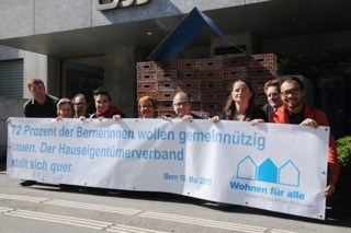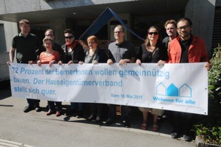 Mit der Aktion vor dem Sitz des Hauseigentümerverband macht das Initiativkomitee am 18. Mai auf die Verhinderungstaktik des Verbandes aufmerksam. Mit einem symbolischen