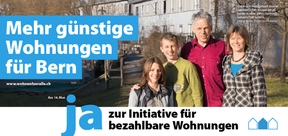 Das Initiativkomitee plant eine aktive Abstimmungskampagne. Es wird eine „Wohnzytig“ mit Hintergrundinformationen und Statements von Fachleuten an alle Berner Haushalte verteilt. Es gibt eine Plakatkampagne mit vier Sujets von Familien und Einzelpersonen, die in einer Berner Wohnbaugenossenschaft oder gemeinnützigen Siedlung leben. Geplant ist eine spannende Podiumsveranstaltung mit Pro-, aber auch kritischen Gegenstimmen am 23.04.2014 im Hotel Bern.